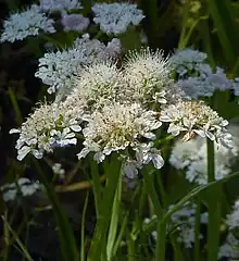 It flowers between July and September in northern Europe, with clusters of 2-4 umbels about 1 cm in diameter, each of which has numerous white to pinkish flowers. A distinguishing feature is that, unlike many other umbellifers, it has no bracts but only small bracteoles on the individual umbels. The rays (stalks to the umbels) are 10-30 mm long and become thicker after flowering.[2][1]