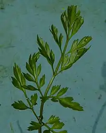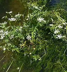 The lower, underwater leaves are once to twice pinnate, with distinctive cuneate (diamond shaped) segments which are deeply divided into almost linear lobes (especially so in faster-flowing water), with petioles as long as the leaf. These submerged leaves remain green throughout the winter but the plants are much reduced, hugging the bottom of the channel. In the summer, the upper, aerial, leaves sometimes form: they are 1-3 times pinnate with ovate, lobed segments about 1 cm long, and have petioles about one third the length of the blade. The petioles on both forms are solid and produce a sheath around the stem at their base.[1]