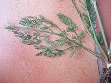 Parsley water-dropwort is a hairless perennial growing up to 100 cm tall with solid (sometimes becoming hollow with age), striated, cylindrical stems 0.4 cm in diameter. The roots are somewhat swollen, cylindrical in shape, but lacking the distinct tubers that occur in some other members of the genus. The upper leaves are once to twice pinnate with simple linear leaflets up to 5 cm long; the lower ones are twice pinnate, with wider, flat leaflets, more like those of other umbellifers. The leaf stalks are shorter than the leaf blade, sheathing the stem at the base, and with a celery scent.[1][2]
