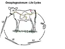 The life-cycle of Oesophagostomum can usually be completed in less than 60 days.[9] When the eggs are passed into the feces to the outside environment, they hatch into stage one larve. The stage two larve then molt twice, developing into infective stage three larva in 6–7 days. These stage three larvae can survive extended periods of desiccation by shrinking within their sheaths.[3]