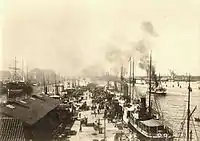 Det Forenede Dampskibs-Selskab was established in 1866 and was based in the former naval hospital from 1872.[2] Most of its ferries to many Danish seaports departed from the pier. The company had daily departures to Aarhus and Aalborg and departures one to three times a week to smaller towns such as Frederikshavn, Fredericia, Kolding, Horsens, Vejle, Randers, Aabenraa, Faaborg, Middelfart, Svendborg and Sønderborg. The pier was extended to its current length in 1877–1878.[3]