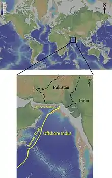 The northwest of the Murray ridge is a major plate boundary transform fault which formed in the Late Oligocene/Early Miocene in response to plate reorganization following the opening of the Gulf of Aden.[4] Onlap of the Miocene and younger stratigraphy on the southeast side of the ridge confirms the age of the ridge and resultant hanging wall uplift. Motion along the Murray ridge bounding fault has resulted in the development of northwest-southeast-trending faults, folds and shale diapirs in the hanging wall. The Makran accretionary wedge, north of the Murray ridge, developed in response to the subduction of the Gulf of Oman oceanic crust beneath Eurasia from about 14 Ma onwards.[8] The southern boundary of the offshore Indus basin is marked by the Saurashtra Arch. It is a volcanic high which extends eastwards into onshore India, coinciding with large outcrop of Deccan volcanics. In the offshore, the arch is cut by steep vertical faults interpreted as extensional faults associated with strike-slip movement along an east-west-trending transform fault marking the northern edge of the Arabian Sea oceanic crust.[2] Two other features have been identified southeast of the Saurashtra Arch, the Laxmi Ridge and the Laxmi Basin. The Laxmi Ridge is interpreted as continental fragment and the Laxmi Basin is considered to be an area of extended continental crust respectively.[9][10][11] The gravity and seismic data suggest that the Laxmi Ridge may represent an area of thinned continental crust which has been subsequently thickened by igneous underplating and the intrusion of thick volcanics similar to the transitional area in the offshore Indus basin.[2]