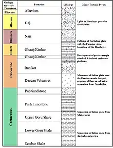Wells drilled on the continental shelf of the offshore Indus basin have been drilled down to Cretaceous rocks. The oldest formation penetrated is the Sembar Formation of Early Cretaceous. It is composed of shales. Onshore Sembar Formation is the major source rock, responsible for charging the sands of the Goru Formation. Sembar is overlain by Goru Formation. Goru is subdivided into Lower and Upper Goru. Lower Goru is sandy onshore and a proven reservoir. Offshore, however, it shales out. Upper Goru is a massive shale and was deposited during Late Cretaceous. It is overlain by Parh Limestone, Mughalkot (limestone interbedded with shale) and Pab Sandstone Formations, deposited during Late Cretaceous.[1] Deccan volcanics of the Paleocene overlie the Cretaceous Pab Sandstone. These are overlain by Ranikot Formation (majorly sandstone), also Paleocene in age. Eocene carbonates, Ghazij/Kirthar lie on top of the Paleocene Ranikot Formation. Nari (Oligocene in age), Gaj (Miocene) and recent sediments, were brought down by the Indus river after the Himalayan uplift and deposited over the Eocene carbonates.[1][2]