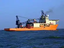 A pipelay barge, or lay barge, is used to lay submarine pipelines by welding pipe sections to the pipeline on board, inspecting and coating the joint, and lowering the assembled part to the seabed over a projecting supporting structure called a stinger which guides the pipe and controls the curve at the end of the barge (overbend) in a more or less continuous process. As the pipe approaches the seabed, the pipe takes a convex-downward curve (the sagbend) before making contact with the bottom. the sagbend is controlled by tension applied from the vessel and tension wires from the pipeline on the bottom to anchors which prevent it from being dragged out of position by the barge.[6]