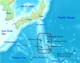 The Bonin and Volcano islands are the central portion of the Izu–Bonin–Mariana Arc, an island arc created by the subduction of the Pacific Plate under the Philippine Sea Plate that stretches 2800 km.