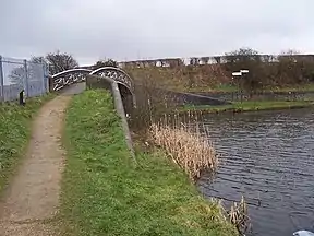 The branch to Lichfield and Huddlesford heads east, and the start of the canal is spanned by a grade II listed cast iron bridge. Each side of the elliptical arch is made from two castings, which are bolted together in the centre, and one of them carries the inscription "Horseley Ironworks 1829".[9]