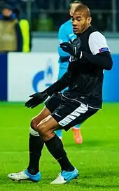 In June 2011, Onyewu joined Portuguese side Sporting CP on a free transfer where he signed a three-year deal from A.C. Milan.[26] In Sporting CP's first five competitive games of the season, three Primeira Liga and two European qualifying matches, Sporting manager Domingos Paciência opted to start central defenders Daniel Carriço and Alberto Rodríguez alongside Ânderson Polga, which left Onyewu on the bench. Injuries during the start of the season to Carriço and Polga led to manager Domingos Paciência starting Onyewu in Sporting's line-up. Onyewu made his team debut on the September 10 in a 3–2 away victory over Paços de Ferreira where he would play the full 90 minutes.[27][28] He scored his first goal for Sporting CP against Rio Ave at the Estádio dos Arcos on September 19, a week after making his Sporting CP debut, in a 3–2 win in which Onyewu scored the winning goal from a header after a Diego Capel corner kick found him unmarked in the penalty area.[29][30]