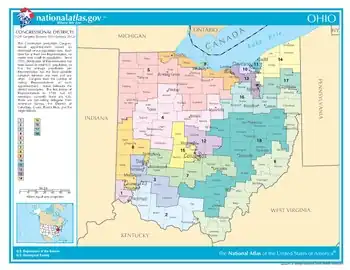 Ohio is divided into 15 congressional districts, each represented by a member of the United States House of Representatives. After the 2010 census, Ohio lost two House seats due to slow population growth compared to the national average,[1] and a new map was signed into law on September 26, 2011. Starting in the 2022 midterms, per the 2020 United States census, Ohio will lose a congressional seat.[2]
