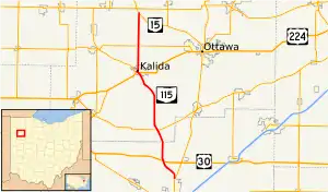 State Route 115 (SR 115) is a 21.71-mile (34.94 km) long north–south state highway in the western portion of the U.S. state of Ohio. The highway has its southern terminus at a T-intersection with SR 65 in the northernmost portion of the city of Lima. The northern terminus of SR 115 is at a T-intersection with SR 15 approximately 3.75 miles (6.04 km) southeast of the village of Continental.