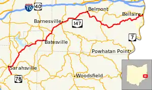 State Route 147 (SR 147) is an east-west state highway in the eastern portion of the U.S. state of Ohio. Its eastern terminus is at State Route 7 near Bellaire, with its western terminus at SR 78 in Noble County, Ohio. The highway passes near Senecaville Lake near Batesville.[2]