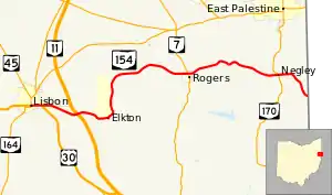 SR 154 turns back east, with the correctional institution on the north side of the roadway, highway passes through a mix of farmland and woodland and enters Elkton. In Elkton the highway heads north, with the correctional institution on the west of the highway, before turning northeast. The road passes through mostly woodland, with some farmland and houses. The route turns southeast, before heading east and entering the town of Rogers. In Rogers the highway passes through residential and a traffic signal with SR 7. East of SR 7 the road heads northeast passing through woodland and running parallel to a railroad track. The route curves southeast and enters the town of Negley. In Negley the road has a short concurrency with SR 170. East of Negley the highway heads southeast towards Pennsylvania. SR 154 ends at the Pennsylvania state line and continues into the state as Pennsylvania Route 251.[4][5][6]