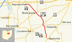 State Route 179 (SR 179) is a 15.52-mile (24.98 km) long north–south state highway in the central portion of the U.S. state of Ohio. SR 179 runs from its southern terminus at the duplex of SR 39 and SR 60 nearly 0.50 miles (0.80 km) northwest of the limits of the village of Nashville to its northern terminus at a signalized intersection with SR 60 in Hayesville.