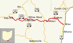 State Route 217 (SR 217) is an east–west state highway in the southern portion of the U.S. state of Ohio. The western terminus of State Route 217 is at a T-intersection with State Route 141 approximately 1.75 miles (2.82 km) east of the unincorporated community of Kitts Hill. Its eastern terminus is at State Route 7 nearly 1.25 miles (2.01 km) north of the village of Athalia. The route mainly passes through some hilly terrain and drops in elevation before reaching the Ohio River valley.