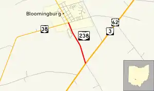 State Route 238 (SR 238) was a short northwest–southeast state highway in the southwestern portion of Ohio. At just over 1 mile (1.6 km) in length, State Route 238 had its southern terminus at the U.S. Route 62 (US 62)/SR 3 concurrency less than 1 mile (1.6 km) southeast of Bloomingburg. Its northern terminus was at SR 38 in the downtown of the Fayette County village.