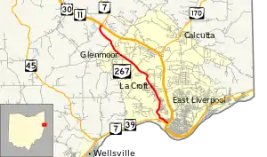 State Route 267 (SR 267, OH 267) is a north–south state highway located in northeast Ohio, a U.S. state. Its southern terminus is at a signalized intersection with the duplex of State Route 7 and State Route 39 in downtown East Liverpool, amidst the interchange where State Route 7 and State Route 39 join the U.S. Route 30/State Route 11 freeway in opposing directions. The northern terminus of State Route 267 is at a diamond interchange with the U.S. Route 30/State Route 7/State Route 11 freeway near Calcutta, one where State Route 7 splits from U.S. Route 30/State Route 11 and takes over for State Route 267 heading north.
