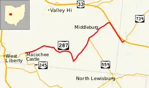 State Route 287 (SR 287) is a 13.69-mile-long (22.03 km) east–west state highway in the western portion of the U.S. state of Ohio. The western terminus of SR 287 is at SR 245 nearly 1.75 miles (2.82 km) east of West Liberty. Its eastern terminus is at an interchange with U.S. Route 33 (US 33) about 5.25 miles (8.45 km) northeast of North Lewisburg that dually serves as the southern terminus of SR 739.