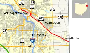 State Route 289 (SR 289) is a 9.93-mile (15.98 km) east–west state highway in the northeastern quadrant of the U.S. state of Ohio. The western terminus of SR 289 is at a diamond interchange with U.S. Route 422 (US 422) and SR 193 in Youngstown. Its eastern terminus is at the Pennsylvania state line just 0.50 miles (0.80 km) east of Lowellville. Continuing east into Pennsylvania after SR 289 ends is locally-maintained Graham Road.
