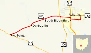 SR 316 begins at a five-point intersection with SR 56 and Palestine–Williamsport Road in the aptly-named Five Points community within Monroe Township. The route heads east-northeast through farmland for about 4 miles (6.4 km) before entering the village of Darbyville. After its brief stint in Darbyville, the route crosses the Big Darby Creek and climbs a hill before entering more farmland. SR 316 gradually curves due east and intersects SR 104 before crossing the Scioto River and entering South Bloomfield. In South Bloomfield, the road reaches US 23 (Walnut Street) at a signalized intersection. SR 316 turns south onto US 23 for six blocks before SR 316 turns east onto Ashville Road. As the road crosses over Mud Run and exits South Bloomfield, the road name becomes Pickaway Street. The road then enters Ashville as West Main Street. In the center of town, SR 316 turns north onto Long Street. The route ends at a four-way intersection with SR 752 though the road continues ahead as County Route 28.[2]