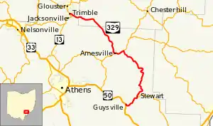 State Route 329 (SR 329) is a state highway located in southeastern Ohio. The route is signed as a north–south route though the shape of the road is more of a backwards C. The southern terminus of SR 329 is in the Rome Township community of Guysville at US 50 and SR 32. After traveling north through the Athens County communities of Stewart and Amesville, the route briefly enters Morgan County before re-entering Athens County and ending at SR 13 in the village of Trimble.[4]