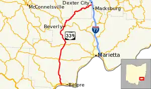 State Route 339 (SR 339) is a north–south state highway in southeastern Ohio, a U.S. state. The southern terminus of SR 339 is at SR 618 approximately 2 miles (3.2 km) west of Belpre, and less than 0.50 miles (0.80 km) south of the U.S. Route 50 (US 50)/SR 7/SR 32 expressway. The highway's northern terminus is a T-intersection with SR 821 about 0.75 miles (1.21 km) south of Dexter City.
