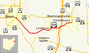 State Route 344 (SR 344) is an east-west state highway lying entirely in Columbiana County, Ohio. Its western terminus is at State Route 14 and State Route 9 in downtown Salem, and its eastern terminus is along a concurrency with State Route 164 in downtown Columbiana.