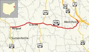 State Route 518 (SR 518) is an east–west state highway located entirely in Columbiana County in northeast Ohio. The western terminus of SR 518 is at SR 644 north of Summitville. Its eastern terminus is at the concurrency of U.S. Route 30 (US 30) and SR 45 near West Point.