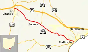 State Route 588 (SR 588) is an east–west state highway in the southeastern portion of the U.S. state of Ohio. The western terminus of SR 588 is at SR 325 in Rio Grande. Its eastern terminus is at a signalized intersection with SR 7 in downtown Gallipolis.