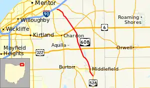 State Route 608 (SR 608) is a north–south state highway in the northeastern portion of the U.S. state of Ohio. Its southern terminus is at State Route 528 about 2 miles (3.2 km) south of Middlefield. The northern terminus is at Ravenna Road (Lake County Road 360, former State Route 44) about 4 miles (6.4 km) south of Painesville. The route passes through one of the largest Amish settlements in Ohio; an Amish-run cheese factory is located at Nauvoo Road north of Middlefield.