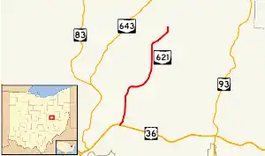All of SR 621 is located within the confines of Coshocton County. This spur route is not included within the National Highway System.[5]