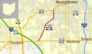 State Route 625 (SR 625) is a state route in northeastern Ohio that exists entirely within Mahoning County. The southern terminus of SR 625 is at U.S. Route 224 (US 224) near Boardman, and its northern terminus is at US 62 in the southwestern portion of Youngstown. SR 625 is currently signed north–south, but in the past was signed east–west.