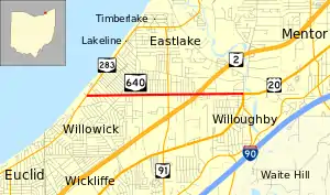 State Route 640 (SR 640) is an east–west state highway in the northeastern portion of the U.S. state of Ohio. SR 640 has its western terminus is at a signalized intersection with SR 283 (Lakeshore Boulevard) in Willowick. Its eastern terminus is in downtown Willoughby at a signalized intersection where it meets US 20 and SR 174, the latter of which has its northern terminus at this same intersection.