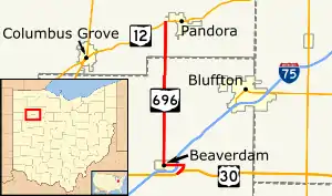 State Route 696 (SR 696, OH 696) is a north–south state route in the western part of the U.S. state of Ohio. State Route 696's southern terminus is at an interchange with the U.S. Route 30 expressway about 1 mile (1.6 km) east of Beaverdam.
