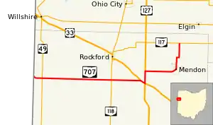 State Route 707 (SR 707) is a 19.45-mile-long (31.30 km) east–west state highway in the western portion of the U.S. state of Ohio. The western terminus of SR 707 is at the Indiana state line approximately 7.50 miles (12.07 km) southwest of Willshire, where it transitions into Indiana State Road 218. The eastern terminus of SR 707 is at SR 117 nearly 3 miles (4.8 km) north of Mendon.