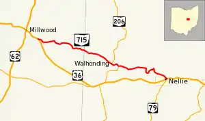 State Route 715 (SR 715) is an east–west state highway in the central portion of the U.S. state of Ohio. Both of its termini are at US 36, with its western endpoint approximately 4.50 miles (7.24 km) southeast of Danville, and its eastern end on the eastern village limits of Nellie. Near its eastern terminus, SR 715 crosses over the top of the Mohawk Dam.