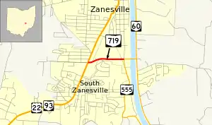 State Route 719 (SR 719) is a very short east–west state highway located in central Ohio, a U.S. state. Situated within the southernmost sections of the city of Zanesville as well as parts of South Zanesville and Springfield Township, SR 719 is a four-lane undivided route whose primary purpose is to connect the concurrency of US 22 and SR 93 (Maysville Avenue) at its western end with SR 555 at its eastern end, which, in turn, meets SR 60 just across the Muskingum River from SR 719's eastern terminus.