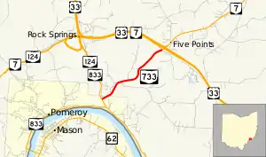 State Route 733 (SR 733) is a state highway in south-central Meigs County, Ohio. At a length of 2.24 miles (3.60 km) long, the route acts as a connector from State Routes 124 and 833 in the north-easternmost extents of Pomeroy to an interchange with US 33 and SR 7 near the unincorporated community of Five Points within Salisbury Township. The road itself is the former routing of SR 7 before it was moved onto an expressway; following 15 years of county maintenance and control as Meigs County Road 7A, this segment of road assumed state jurisdiction again in late 2013.