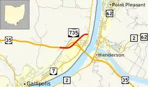 State Route 735 (SR 735) is a short east–west state highway in southeastern Ohio, located just northeast of the county seat of Gallia County, Gallipolis. The highway runs just under 1.25 miles (2.01 km) in length between its western terminus at a partial interchange with U.S. Route 35 (US 35) and its eastern terminus at a signalized T-intersection with SR 7. The route serves solely as a connector from eastbound US 35 to SR 7, and from SR 7 to westbound US 35. An interchange between these two end routes exists nearby, but only allows access from westbound US 35 to SR 7, and from SR 7 to eastbound US 35. SR 735 is a former alignment of US 35 when it traveled on the Silver Bridge to cross the Ohio River to Point Pleasant, West Virginia.