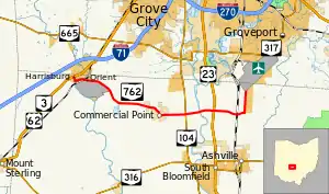 SR 762 is located in the northern portion of Pickaway County passing through the towns of Orient and Commercial Point. Throughout the highway's length, it passes just to the south of the Franklin County line. SR 762 begins at a signalized intersection with US 62 / SR 3 to the south of Harrisburg in Darby Township; to the north, the road continues as Pickaway County Route 20. SR 762 heads south for about 0.3 miles (0.48 km) before it makes a left turn to cross the Big Darby Creek where it enters Scioto Township. After passing an entrance road to the Pickaway Correctional Institution, the route crosses under an Indiana and Ohio Railway overpass and enters the town of Orient skirting the town's southern border throughout its entire length in Orient. After passing another sector of the prison, SR 762 heads east through mostly farmland. Upon entering the town of Commercial Point, SR 762 heads due south through it on Main Street.[4][5]