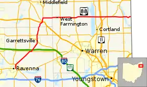 State Route 88 (SR 88) is a highway generally running in an east–west direction in the northeastern portion of the U.S. state of Ohio. Its southern terminus is in Portage County at SR 59 at the intersection of Freedom Street with Main Street in Ravenna.[2] SR 88 is labeled north-south southwest of U.S. Route 422 (US 422) and SR 168/SR 528, and labeled east-west east of there. SR follows a northerly direction for a little more than one mile (1.6 km) along Freedom Street, to the SR 14 and SR 44 concurrency bypass. From here, the route heads in a northeasterly direction. Its next intersection is with SR 700, at the southern terminus of the latter route. One-quarter mile (0.40 km) further to the northeast, SR 88 joins SR 303 for about one-half mile (0.80 km). SR 88 then continues northeast, crossing over Interstate 80 and the Ohio Turnpike, before turning due north as it enters Garrettsville. Here, as South Street, the route intersects SR 82 (State Street and Main Street), then becomes North Street before exiting the corporation limits.