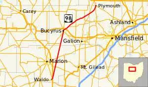 State Route 98 (SR 98) is a north–south state highway in the northern portion of the U.S. state of Ohio. Its southern terminus is at the SR 47/SR 423 concurrency in Waldo, and its northern terminus is at SR 61 in Plymouth.