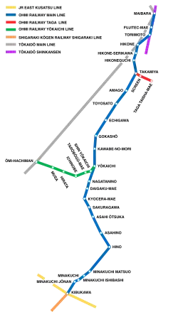 The Main Line connects with the Tōkaidō Main Line (Biwako Line), the Hokuriku Main Line and the Tōkaidō Shinkansen at Maibara, the Biwako Line at Hikone, and the Kusatsu Line and the Shigaraki Kōgen Railway at Kibukawa. The Yōkaichi Line connects with the Biwako Line at Ōmi-Hachiman.