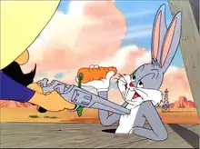After the explosion, instead of oil, a gusher of carrots comes out of the hole blowing Devil Rich Texan and Maverick to the top of the hole's derrick and Bugs exclaims: "Hey! Looks like I brought in a carrot gusher!". After chomping on one of them, he senses some of the audience's slight disbelief at what they are seeing, adding "Yeah, I know, I know...but anything can happen in 'Tex-ay-us'!"