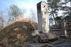 The first is that of Ikeda Terumasa, in the form of a bixi, a tortoise-shaped base stone and a flat monument, both made of granite, and the second is for Ikeda Toshitaka and his wife Tsuruhime. The third is for Ikeda Mitsumasa and his wife Katsuhime. The fourth is for the eighth daimyō, Ikeda Yoshimasa and his wife Utako. The fifth is for the ninth daimyō, Ikeda Shigemasa and his wife Manjuko. The sixth contains six graves, one of which is for Ikeda Teruoki, daimyō of Akō Domain, who reportedly went mad, killing his wife and consorts.[2] Two others in this set are for Ikeda Tsunemoto and Ikeda Masachika, daimyō of Yamasaki Domain. The seventh set is located about 600 meters northeast of the sixths set. It contains the graves of Ikeda Toshimasa (younger brother of Toshitaka, lord of Funage Castle in Harima), Ikeda Masatora (younger brother of Toshitaka), Ikeda Masasada (younger brother of Mitsumasa), and Mutsuhime (daughter of Mitsumasa).