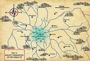 Oke Ora is the most important landmark in a chain of seven hills surrounding the sites of the ancient Ife confederation (The Thirteen clans/provinces, Yoruba: Ẹ̀lú Mẹ́tàlá), which sat in their central depression like the middle of a bowl stretching some 20 km across.[8] Because of the water streams flowing downhill into the center of the bowl, the middle of the Ife bowl was seasonally flooded and swampy.[9] The six other hills are; Oke-Obagbile, Oke-Ipao, Oke-Ijugbe, Oke-Onigbin, Oke-Araromi and Oke-Owu.[10]