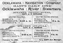 The Okeehumkee, also known as "Queen of the Ocklawaha River," was a river steamboat that provided transportation along Florida rivers in the late 19th century. The Okeehumkee was equipped with a paddle wheel positioned in the lower stern part of the boat which allowed it to traverse narrow and shallow rivers.[3] The steamboat was the longest-serving craft of its type on the Ocklawaha River route, remaining in service for 43 years.[4][5]