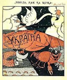 From 1913, he worked in book design, illustrated children's books for Kyiv (later Vienna and Prague) publishing houses "Chas" (Time), "Dniprosoiuz", "Dzvin" (Bell), "Vernyhora"; from 1913 to 1914 he designed the magazine "Siaivo" (Aura) and numerous children's fairy tales (among them, The War of Mushrooms and Beetles, 1919).[1] From 1924, he worked for the Kharkiv and Kyiv publishing houses "Shliakh Osvity" (Path of Education), "Knyhospilka" (Ukrainian Co-operative Publishing Association), "Radianske Selo" (1924-1934, Soviet Village)), "Radianska Shkola" (1935-1941, Soviet School), and the journals Zhovten (October) and Pioneria (Pioneering).[2] He was a member of the pro-Soviet Association of Artists of Red Ukraine formed in 1926.