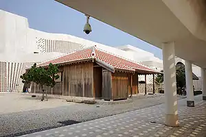 Reproduction of a traditional Okinawan home, erected in front of the museum. The red ceramic roof tiles and shisa lion-dog are particularly distinctive of traditional Okinawan architecture.