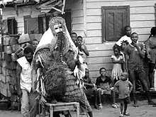 The Okuyi (plural: Mekuyo, also known as Ukuyi, Ocuya, Mokoi, Mukudj, Ikwara, Okukwe and Mbwanda, in Equatorial Guinea (Spanish): Mamarracho[1]) is a rite of passage practised by several Bantu ethnic groups in different countries mainly across the west coast of Central Africa. Some of the countries where the rite is exercised include Cameroon in West Central Africa, Gabon and Equatorial Guinea. Traditionally, the rite is performed at numerous special occasions including funerals and weddings. Usually when an infant reaches four months of age or when a child becomes an adolescent, an Okuyi ritual is applied as well. Today, the Mekuyo rite is exercised by a range of ethnic peoples within the Bantu cluster. The coastal community known as Ndowe, also known as playeros, is a primary example, as peoples across Equatorial Guinea frequently perform the ritual in public.[2] Gabon has two chief ethnic groups that exercise the Okuyi rite including the Mpongwe and Galwa from Lambaréné, Gabon. The man in the custome is usually the leader of the group.