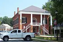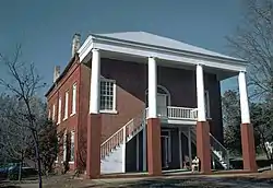 The Old Banks County Courthouse is in Homer, Georgia. Construction started in 1860 but was interrupted because of the American Civil War. Construction was paid for with $6,600 in Confederate money. Construction was finished in 1875. (The Georgia Courthouse Manual dates it as completed in 1863.) The building is a two-story brick courthouse with a stone foundation in the Greek Revival style. It is similar to many courthouses in Virginia, which is a result of the builders being from Virginia. It has Tuscan columns that are on top of one-story brick piers. The interior originally had a cross plan. The courtroom and judge's chambers are on the second floor, which are accessed by outside double stairways.