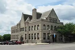The Old Cadillac City Hall is a three-story building constructed of brick with stone facing with a steeply pitched slate roof. The building has Richardsonian Romanesque detailing, including the arched doors and windows.[2] The first floor contains rectangular windows in rectangular opening, the second floor contains round-headed window openings, and the third floor has steeply sloped stone gables. Stone steps approach the monumental, centrally located arched main entrance broad, set into a slightly projecting, entrance pavilion. The pavilion is topped with a peaked gable roof. The east side contains arched stone openings defining the entrances to the original fire station.[3]